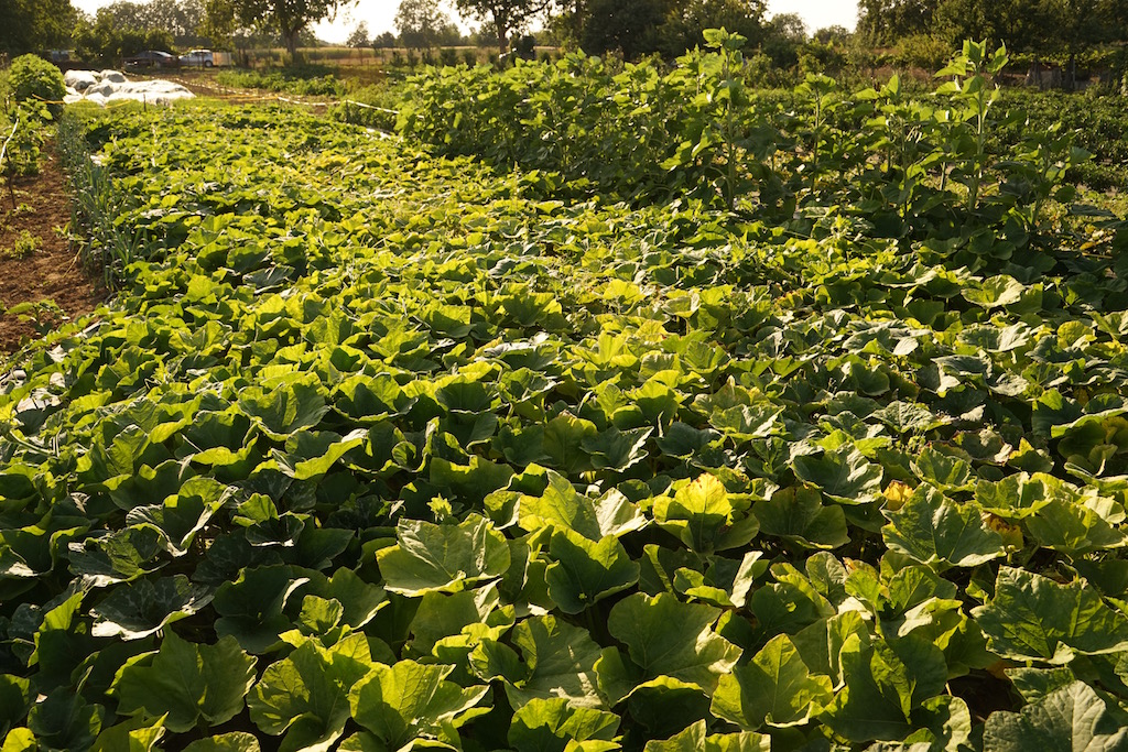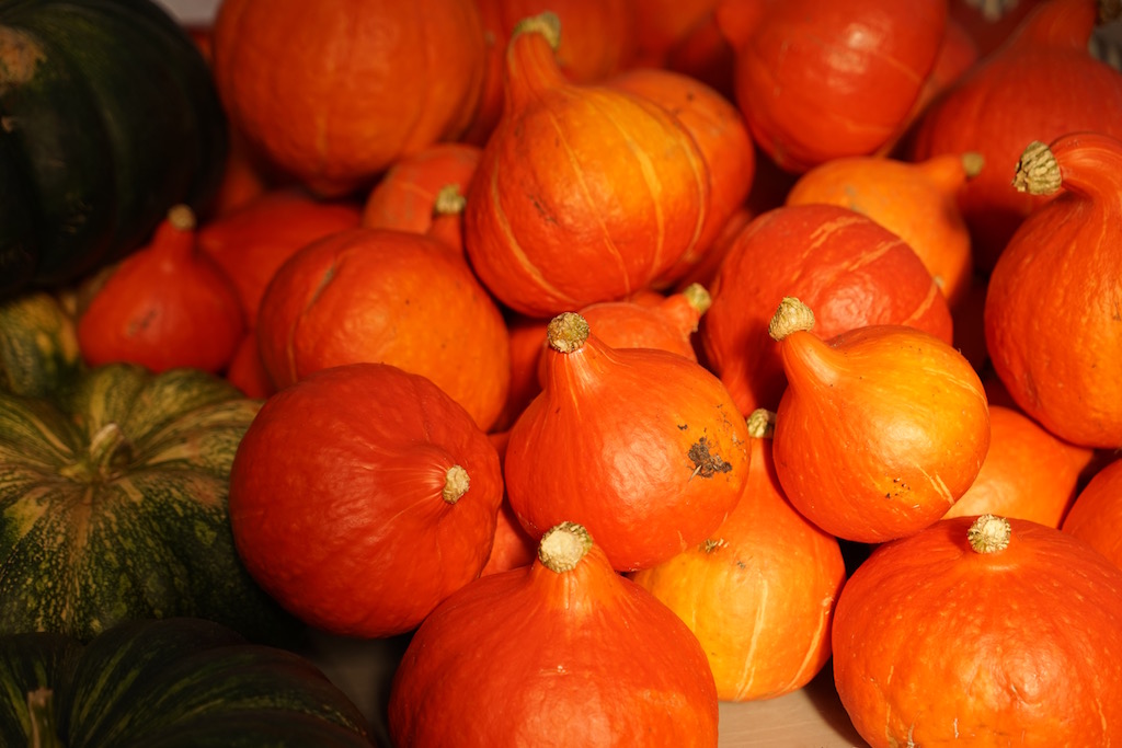 Die ersten Kürbisse wie diese Hokkaido und Muskat können geerntet und getrocknet werden.Die Kürbisse wachsen gut zusammen mit den Sonnenblumen auf dem neuen Ackerstück am Hammelsbrunnen.