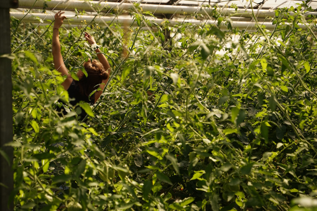 Melanie und Alex schneiden die Haupttriebe unserer Tomaten durch, so können die restlichen grünen Früchte gut abreifen und es werden keine neuen Früchte mehr gebildet.