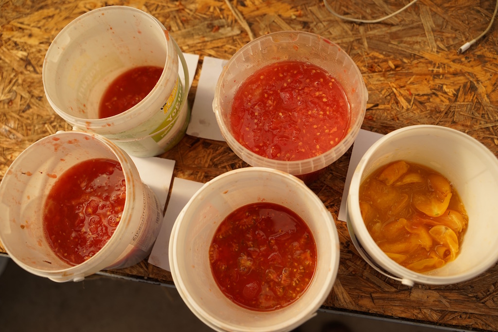 Die Tomatensaatgut Gewinnung ist schnell und einfach. Wir zerquetschen die reifen Früchte und lassen für eine Nacht fermentieren. Danach füllen wir die Behälter mit Wasser auf, so sinken die schweren Samen nach unten und das Fruchtfleisch kann nach und nach abgegossen werden.
