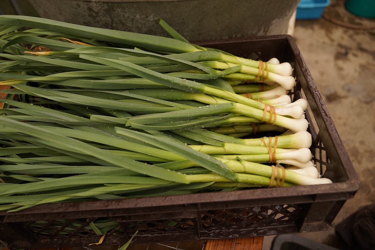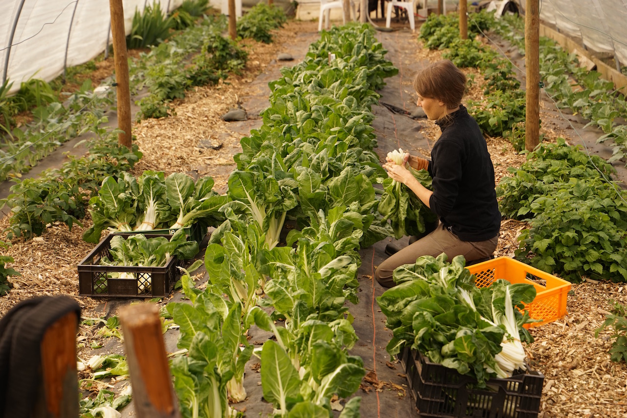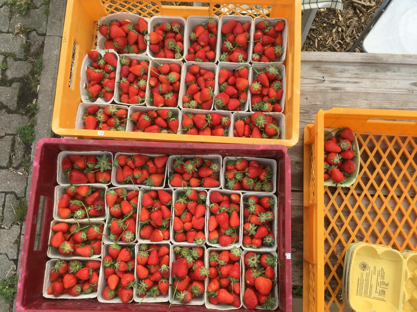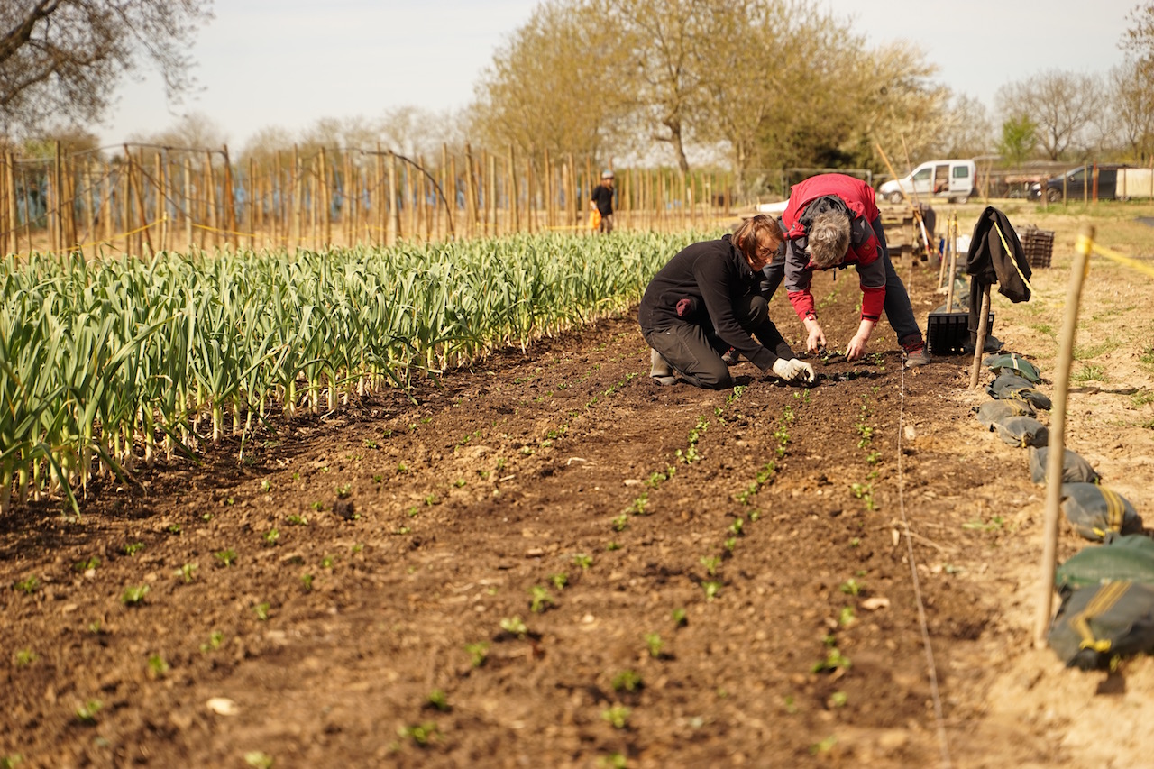 Diese Karotten wurden Ende Oktober ausgesät und überwintert. So können sie im April geerntet werden.Anja bündelt Mangold. Dieses grüne Blattgemüse wird im September in den Tunnel gepflanzt und produziert dann im April schöne große Blätter wenn nicht viele andere Gemüsesorten wachsen.Der junge und grüne Knoblauch kann komplett verwendet werden und wir bündeln die mild nach Knoblauch riechenden Stangen zusammen.Ende April können wir es im Folientunnel schon erahnen und freuen uns auf den Duft von Erdbeeren, der den ganzen Abholraum erfüllt. Anfang Mai ist es so weit, die erste große Ernte kann verteilt werden.Ursel und Silke helfen seit mehr als zwei Jahren jeden Mittwoch in der Gärtnerei und pflanzen hier Knollensellerie am Acker am Hammelsbrunnen. Links steht unser Knoblauch der Anfang Juni geerntet und getrocknet wird.Renate sät jeden Dienstag viele Anzuchtschalen aus. Danke Renate. Hier stehen die Kürbis-Sorten “Red-Kuri“ und “Butternut“ bereit zum pflanzen.