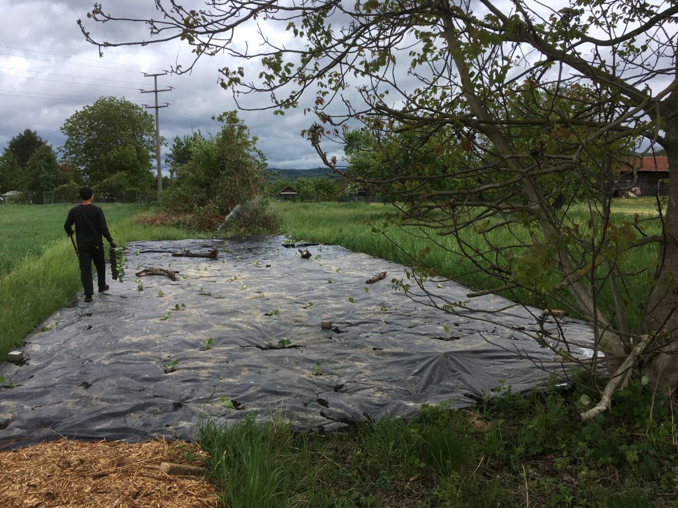 Wir pflanzen Kürbisse in eine Silo-Folie ohne den Boden zu bearbeiten und bereiten so gleichzeitig den Boden für die nächste Saison vor.
