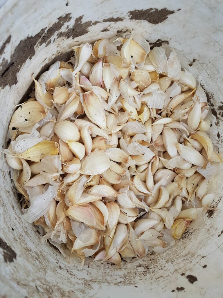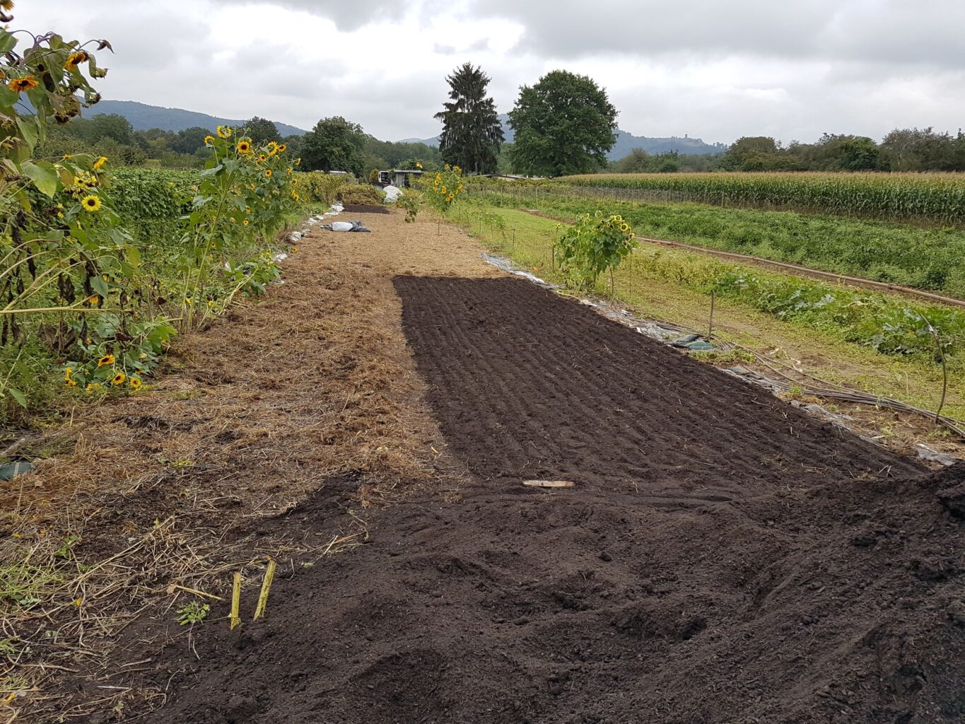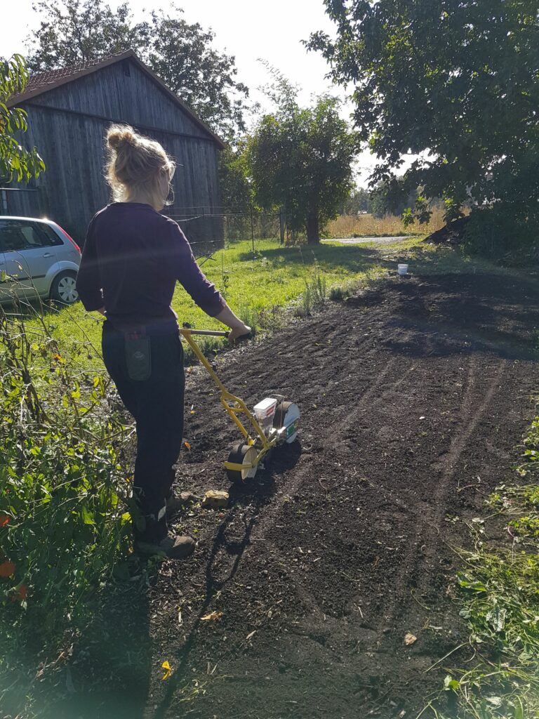 Mitte September ist das Gartenjahr noch lange nicht zu Ende. Wir säen Knoblauch und Radieschen und stecken den Knoblauch für das nächste Jahr. Den übrigen Mulch nutzen wir zur Abdeckung der Knoblauchbeete.