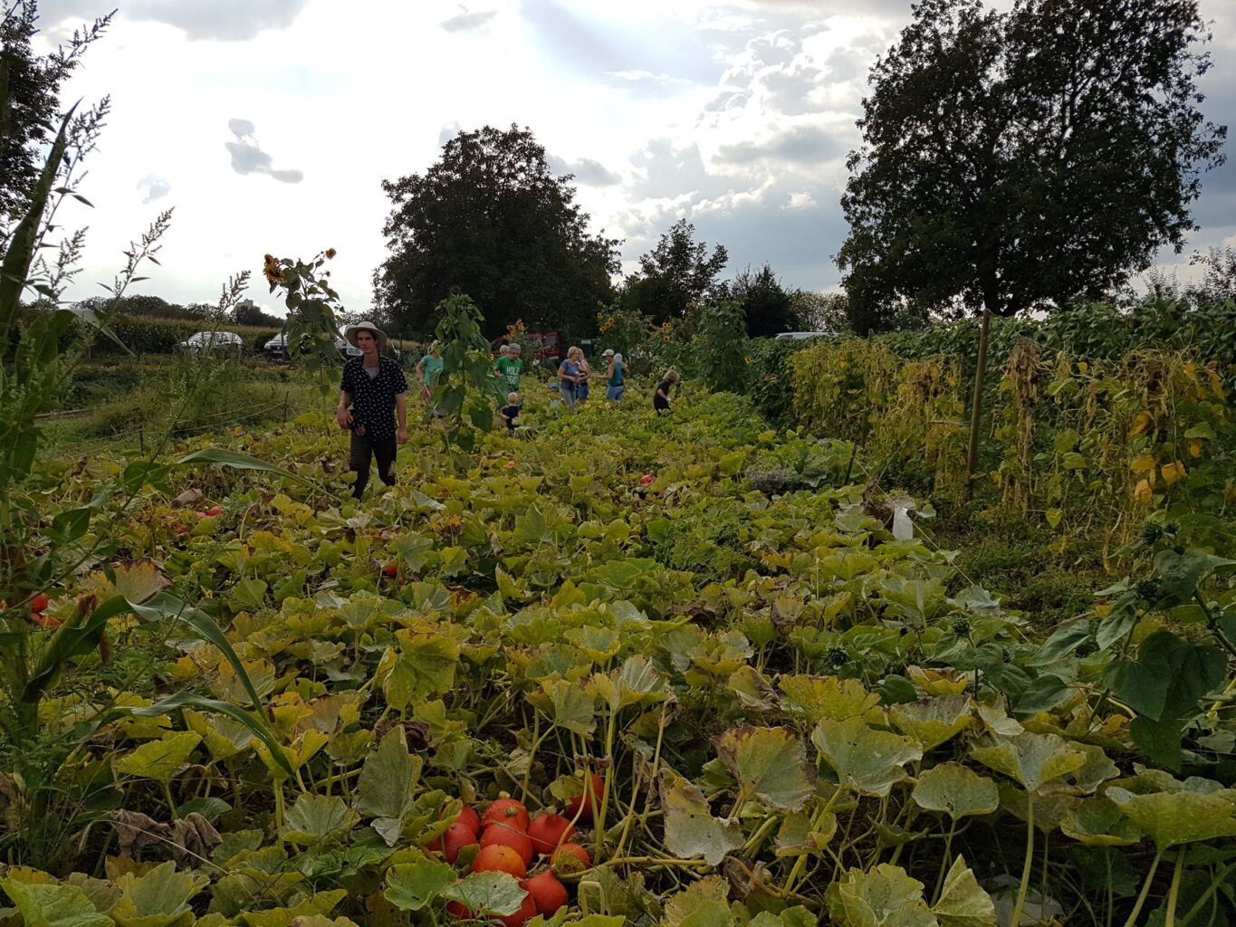 Dem Kürbis tut der feuchte Sommer sehr gut. Wir mussten kein einziges Mal bewässern und dank des Mulchs, in den wir die Kürbispflanzen direkt reingepflanzt haben, müssen wir kaum jäten. Mitte September ist es dann so weit: Mit einer großen Gruppe ist die Kürbisernte rasch erledigt, sodass sich dem mitgebrachten Kuchen gewidmet werden kann. Danke an all diejenigen in der Solawi, die uns immer wieder mit großen und kleinen Köstlichkeiten versorgen.