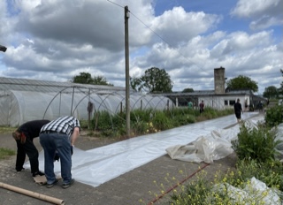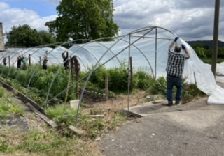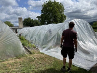 Eine andere Aktion mit vielen Helfern war der Austausch der alten Folie bei beiden Pflanzentunneln, Ersatz war dringend nötig, weil Wind und Wetter dem Material ganz schön zugesetzt hatten. Beim Austauschen war es zwar nicht windig – aber auch mit dem Zuwerfen der Seilrolle kann man den Schwierigkeitsgrad erhöhen.