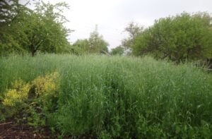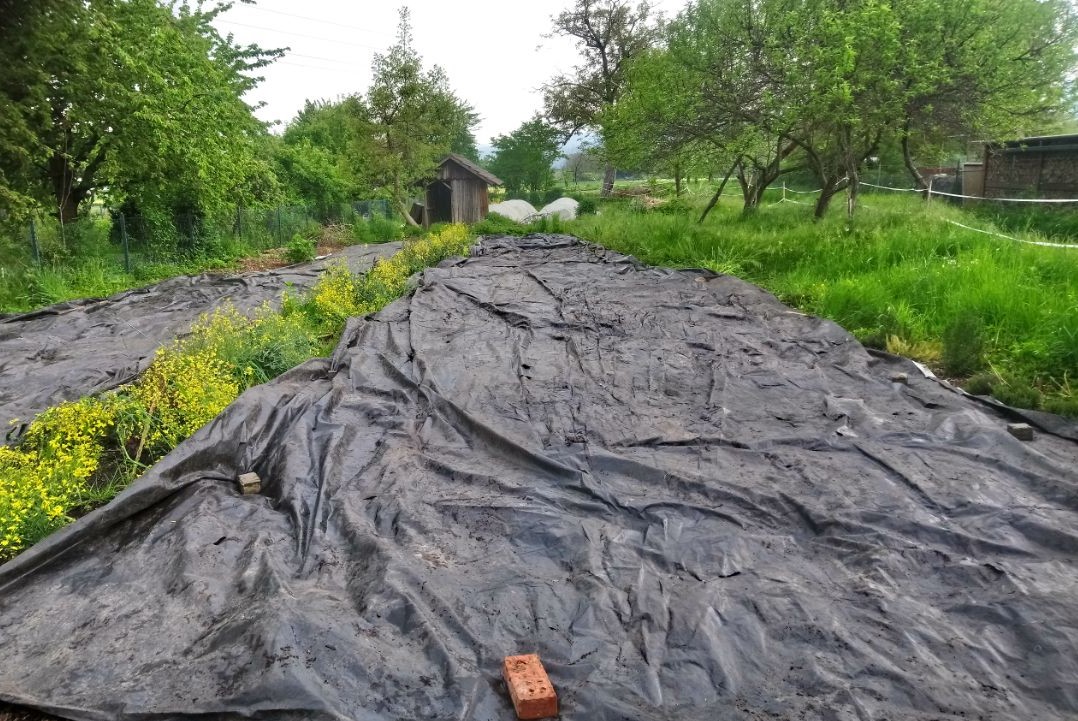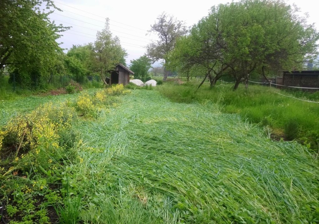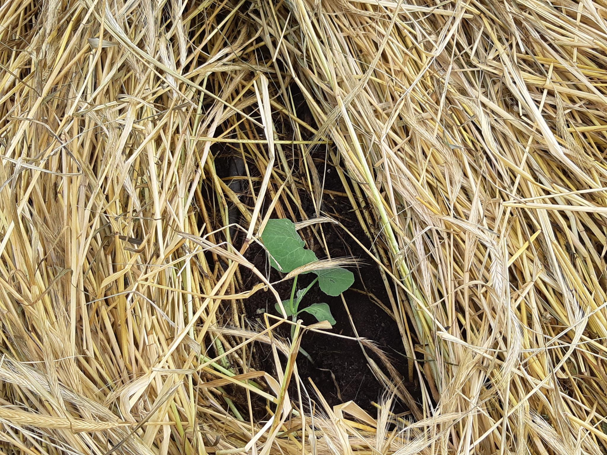 In diesem Jahr konnten die neuen Gärtner zum ersten Mal eine Kürbiskultur mit Gründüngung vorbereiten. Dabei wir zunächst das Grünzeug ausgesät, eine Mischung aus Winterroggen, Futtererbsen, Klee und Senf. Wenn alles schön hoch gewachsen ist, wird die Fläche „gecrimpt“ (die Pflanzen werden einfach umgeknickt) und mit Folie abgedeckt. Etwa drei Wochen später, wenn die Düngerpflanzen abgestorben sind, werden die kleinen Kürbispflanzen mittendrin eingesetzt und können so geschützt und gut genährt heranwachsen.