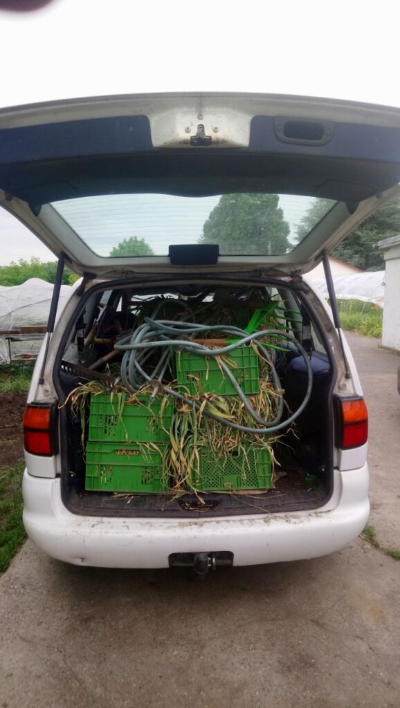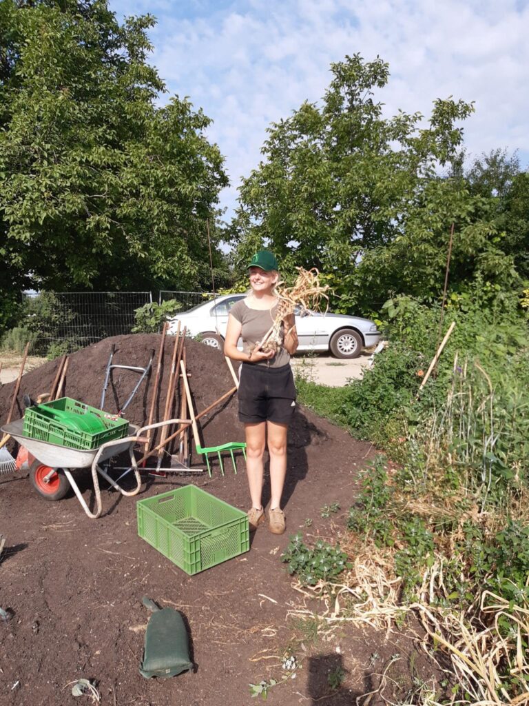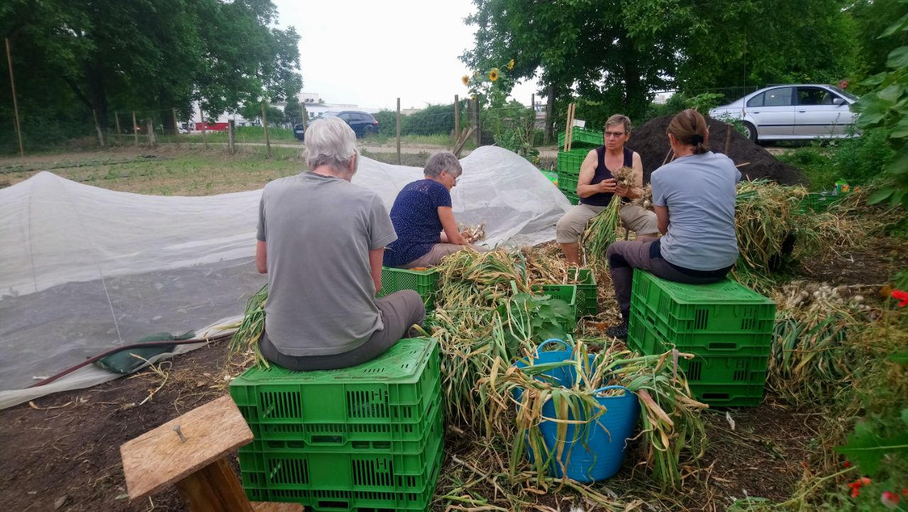 Am 22. Juni trafen wir uns für die Knoblauchernte um 9 Uhr früh am Hammelsbrunnen, ausgerüstet mit Sonnenschutz und Wasser. Gemeinsam ging die Ernte prima voran. Nach der Feldarbeit folgte dann noch das Säubern und Bündeln. Der Knoblauch wurde diesmal gleich an alle Mitglieder verteilt mit Hinweisen, wie man ihn lagert und trocknet.