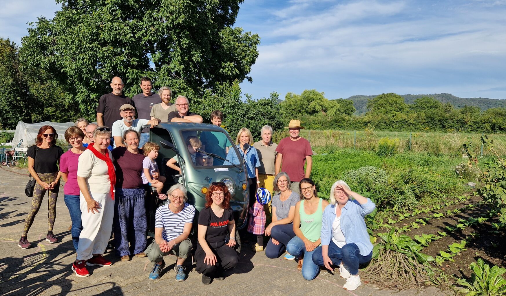 Am letztem Samstag im August waren die Mitglieder und deren Familien zu einem Sommerfest eingeladen. Die Mitglieder, die in den Sommerferien vor Ort waren, konnten dabei gleich unser neuestes „Mitglied“ bewundern. Der grüne Elektro-Frosch war gerade frisch eingetroffen und wurde spontan ausprobiert und begutachtet. Zukünftig können mit dem elektrisch betriebenen CargoRunner Gemüse und Arbeitsmaterialien von und zu unseren verstreuten Feldern transportiert werden.